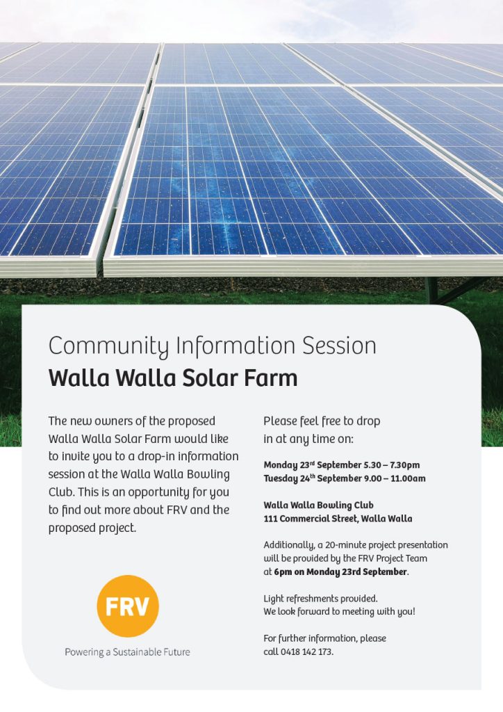 The new owners of the proposed Walla Walla Solar Farm would like to invite you to a drop-in information session at the Walla Walla Bowling Club. This is an opportunity for you to find out more about FRV and the proposed project.